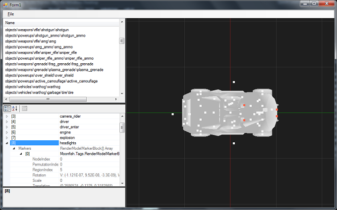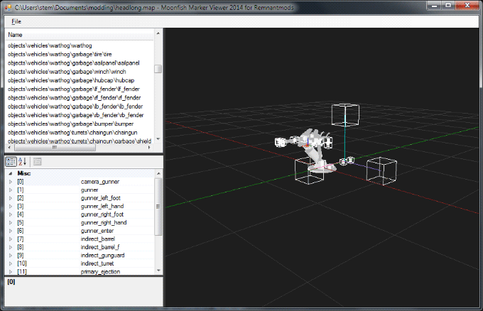 Probably 70% of the models don't display correctly, filling the screen with planes of gold, or sometimes entire sectors of the coordinate system. For the models that do display (most guns), it's really cool. I like how clicking the marker on the model takes you to that property in the property viewer. Could it work the other way around too (click the marker property to select the marker in the model viewer)? Maybe a bonus feature for later.